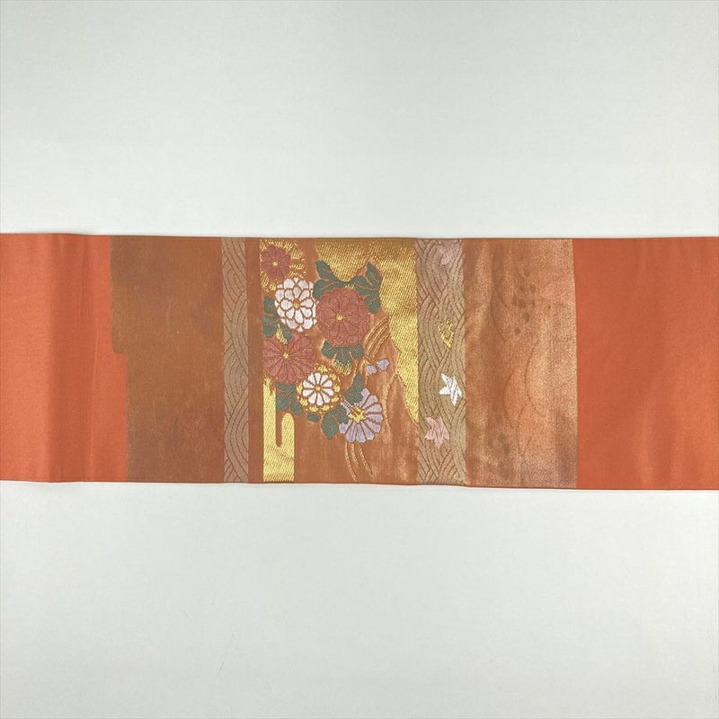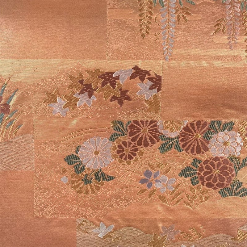 (中古)名古屋帯 薄柿色 オレンジ カジュアル 名古屋仕立て 切箔 金糸 四季花 露芝 波 霞
