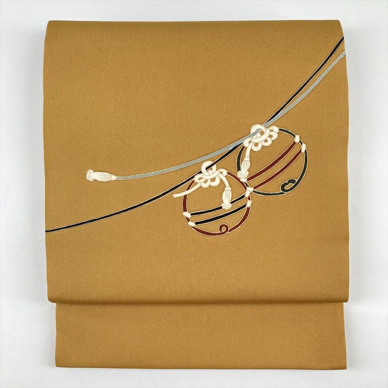 (中古)名古屋帯 金茶色 濃黄色 カジュアル 平仕立て 塩瀬 染め 組紐に鈴