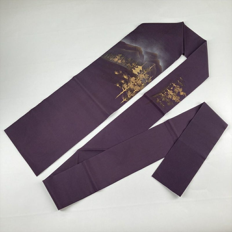 (中古)名古屋帯 濃紫色 カジュアル 名古屋仕立て 塩瀬 染め 金彩 遠山 木立 三重の塔