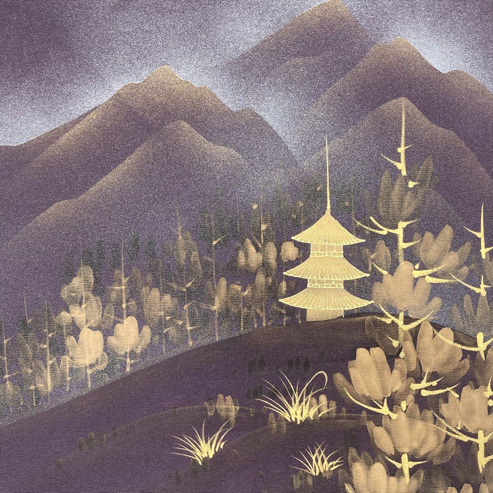 【色柄】濃紫色 カジュアル 遠山 木立 三重の塔 塩瀬 染め 金彩