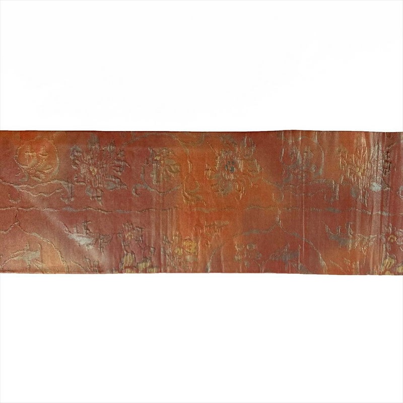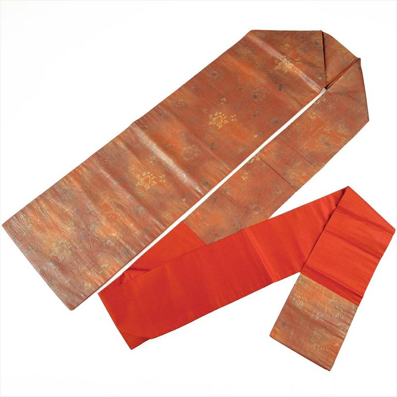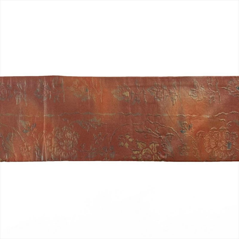 (中古)名古屋帯 赤茶色 カジュアル 名古屋仕立て うるし箔調 ふくれ織り 花唐草