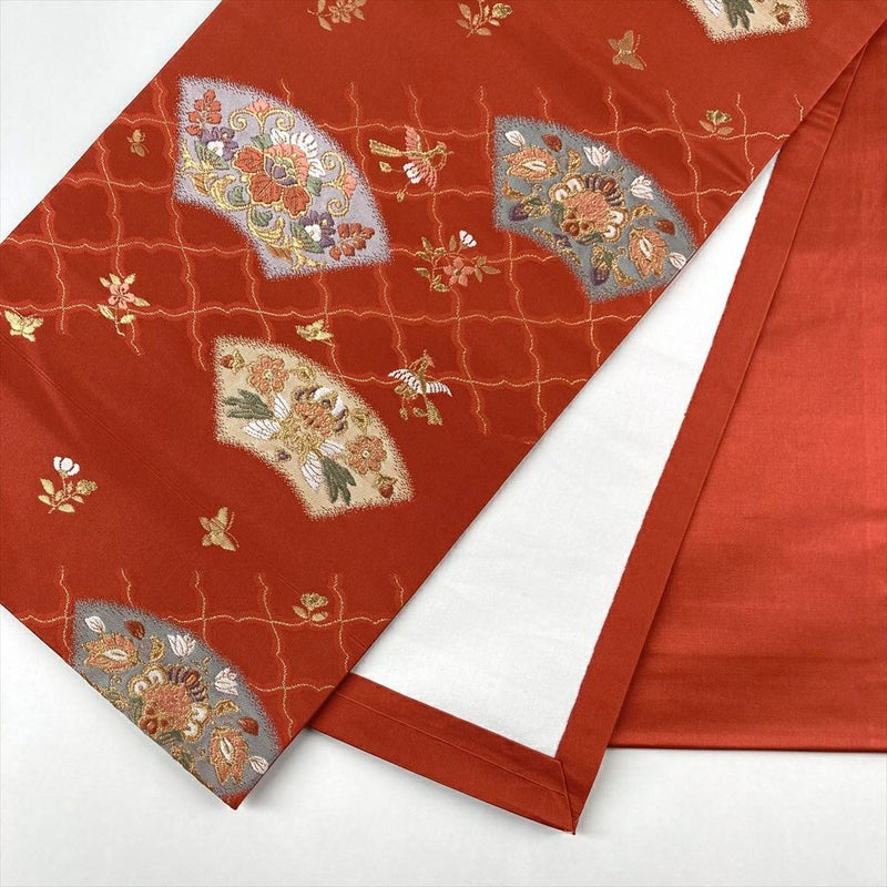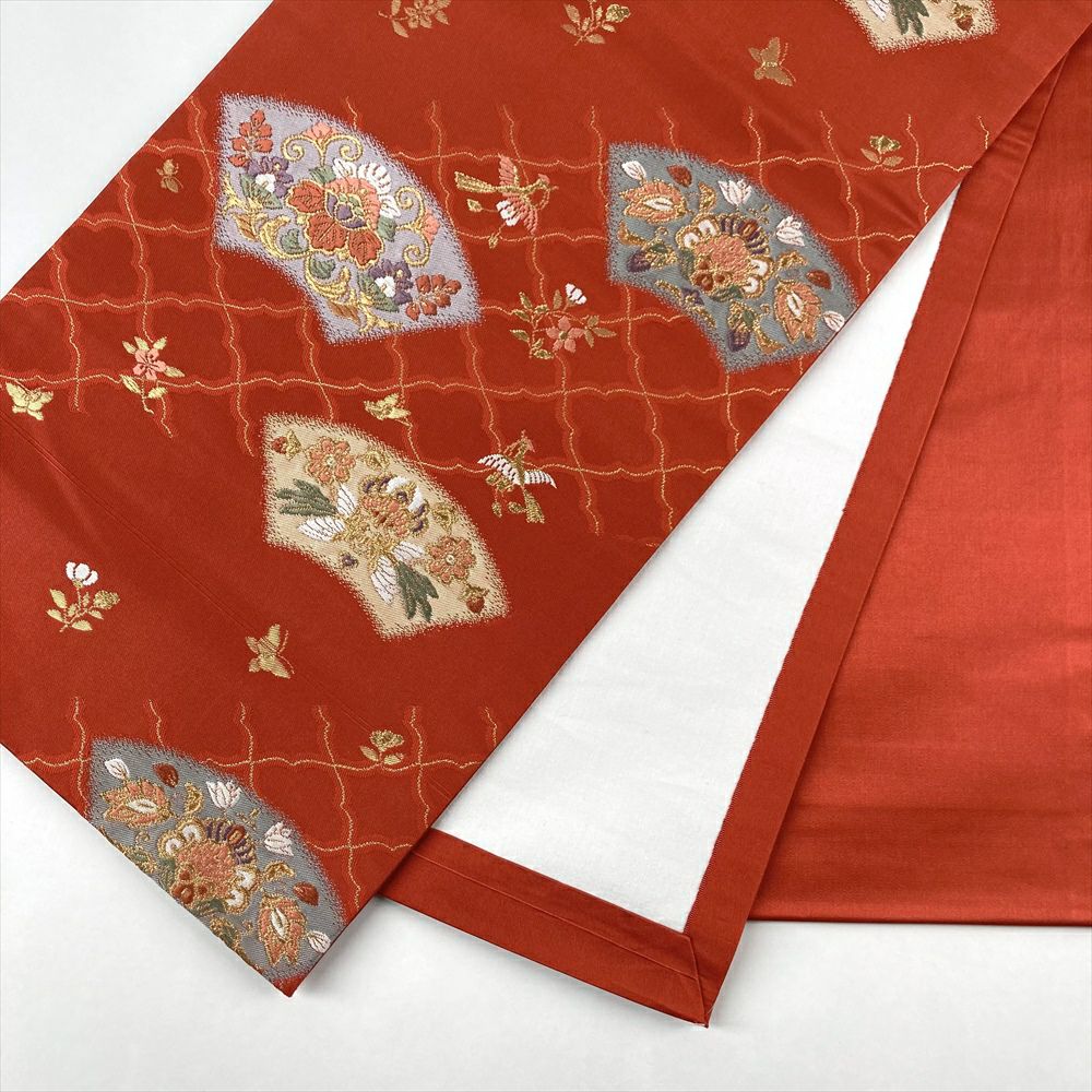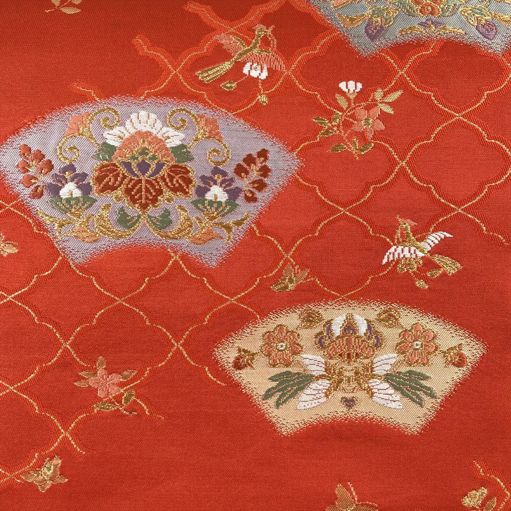 【色柄】赤色 カジュアル 扇面に花鳥 金糸 色糸