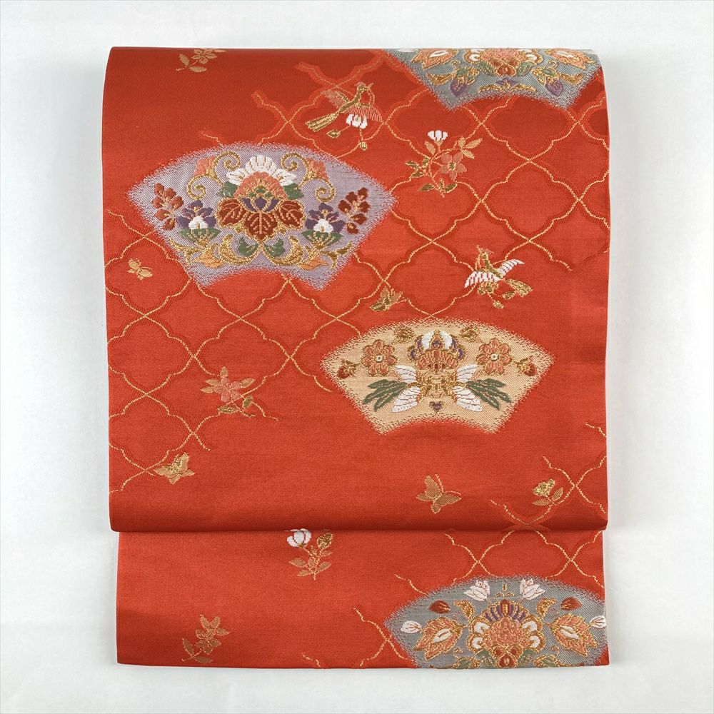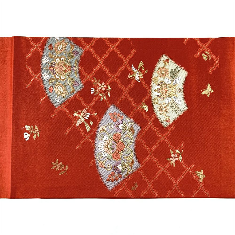 (中古)名古屋帯 赤色 カジュアル 平仕立て 金糸 色糸 扇面に花鳥