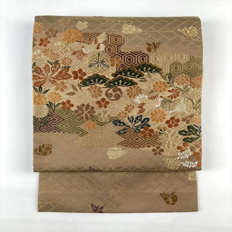 (中古)名古屋帯 薄茶色 カジュアル 名古屋仕立て 引き箔 金糸 色糸 花鳥 吉祥文