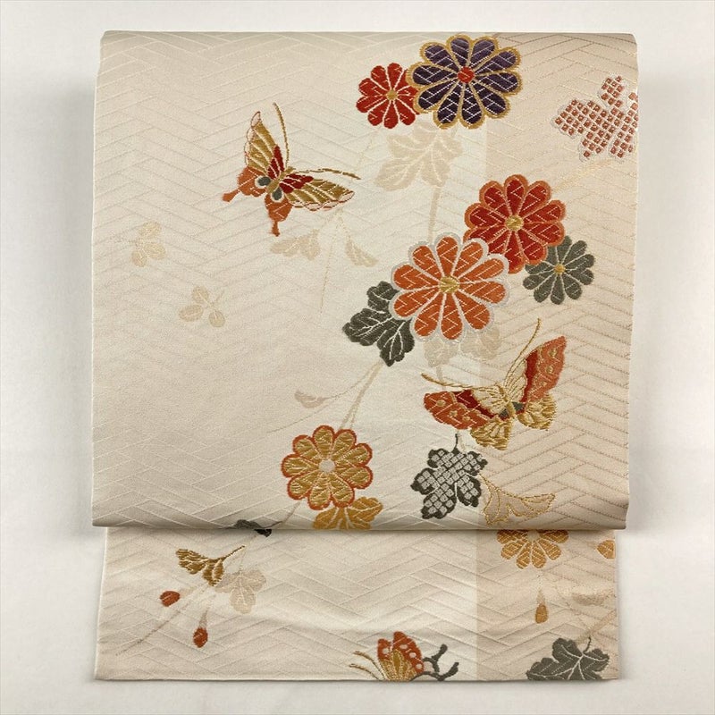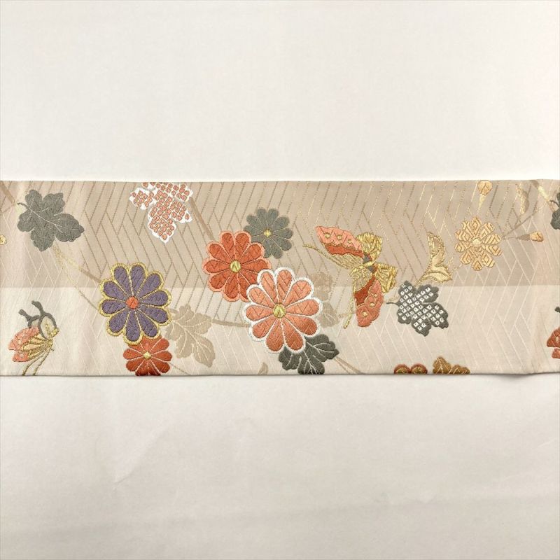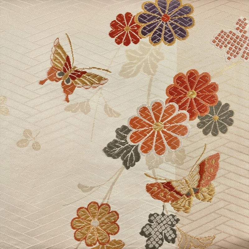 【色柄】クリーム色 アイボリー色 カジュアル 花蝶 桧垣文 織り 引き箔 金糸