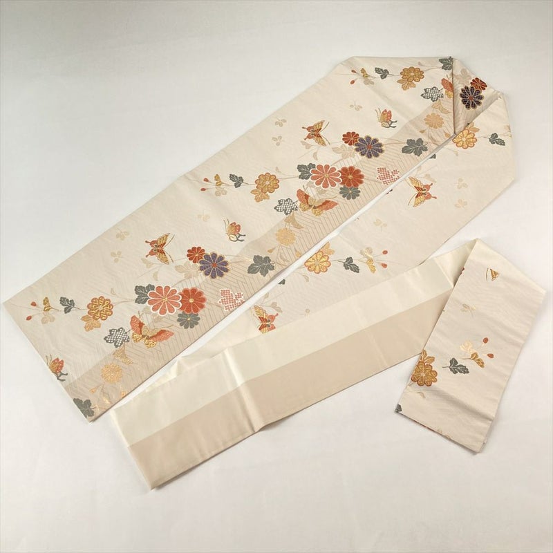 (中古)名古屋帯 クリーム色 アイボリー色 カジュアル 名古屋仕立て 織り 引き箔 金糸 花蝶 桧垣文