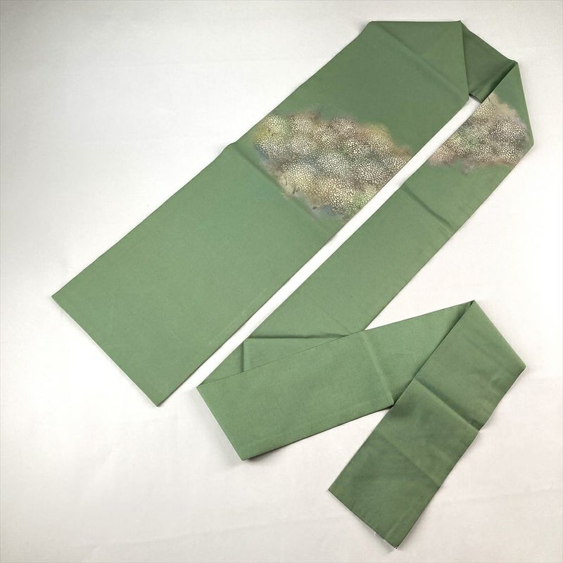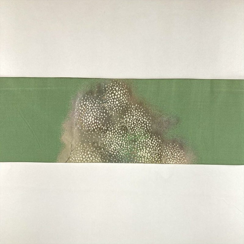 (中古)名古屋帯 薄緑色 カジュアル 名古屋仕立て 引き箔 色糸 桜の園