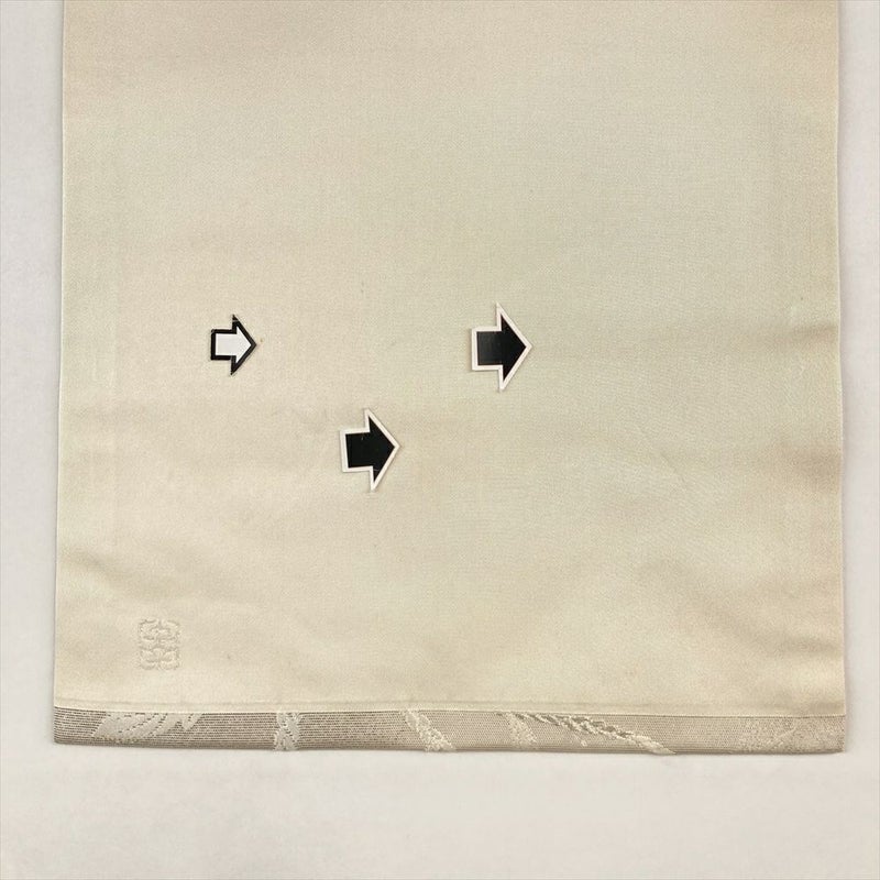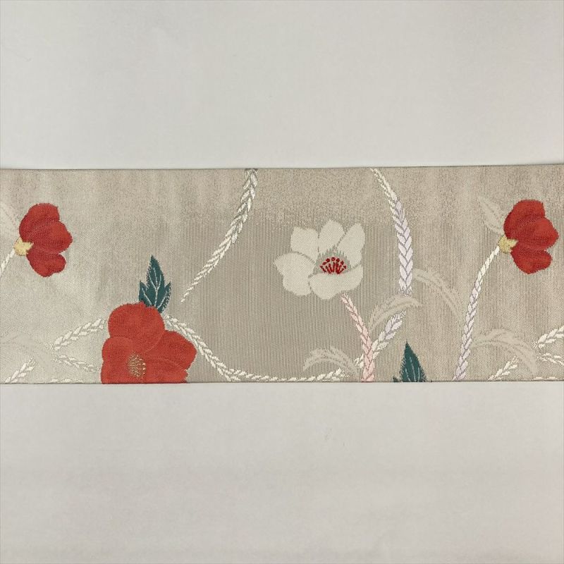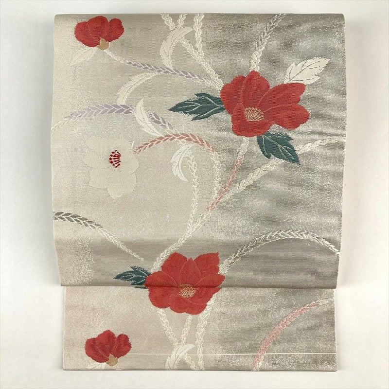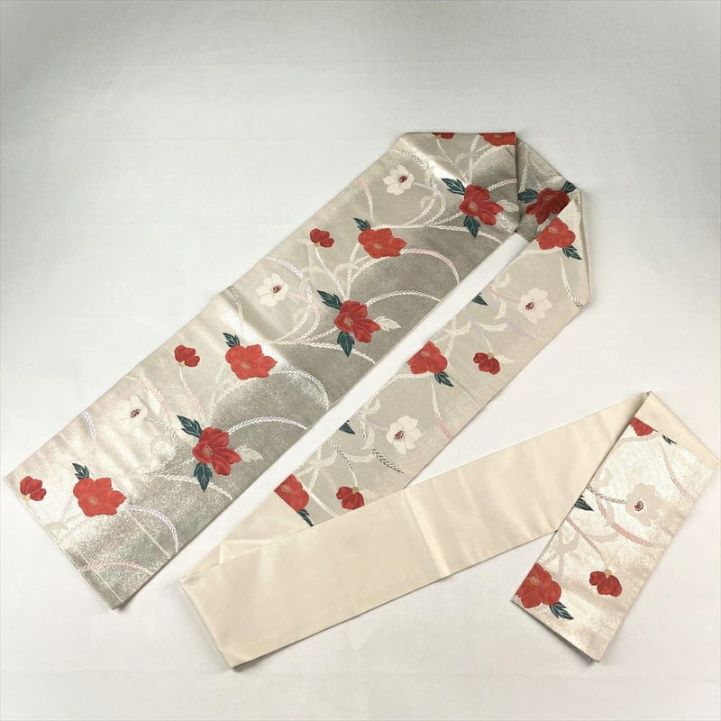 (中古)名古屋帯 銀色 カジュアル 名古屋仕立て 引き箔 椿 組紐 絹