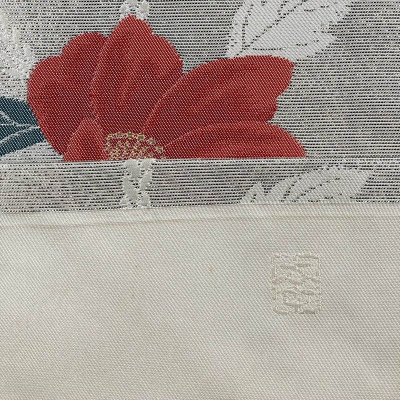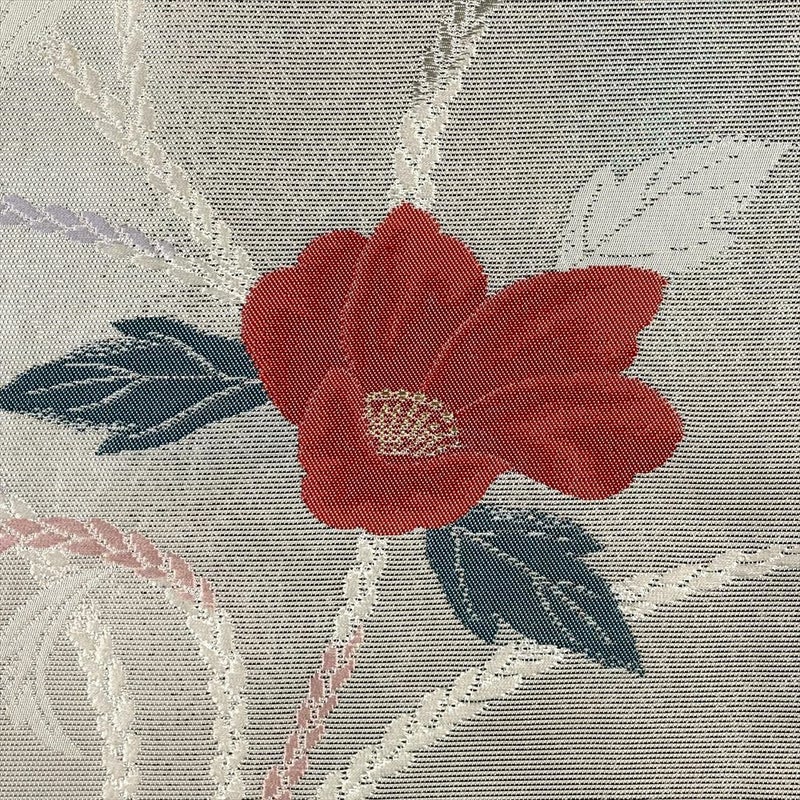 椿は冬に花を咲かせることから、冬の寒さにも負けずに凛と咲く花として、古くから日本人に愛されてきました。銀色の地に織り出された椿は、その気品ある姿をより際立たせます。