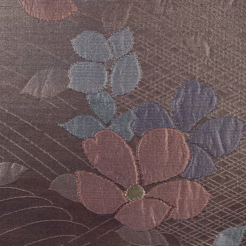 【色柄】茶紫色 カジュアル 椿 流水 引き箔 ふくれ織り