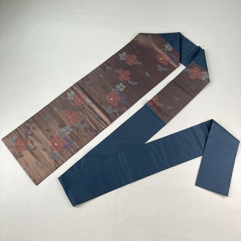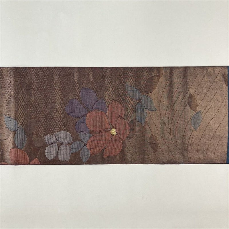 (中古)名古屋帯 茶紫色 カジュアル 名古屋仕立て 引き箔 ふくれ織り 椿 流水 絹