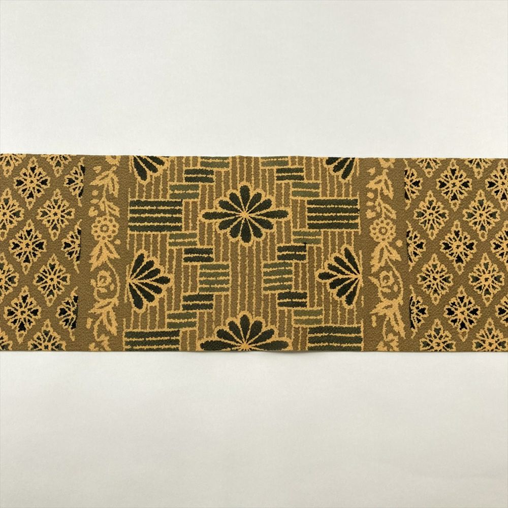 (中古)名古屋帯 芥子色 黄色 カジュアル 名古屋仕立て ちりめん 染め 菱 花唐草 絹