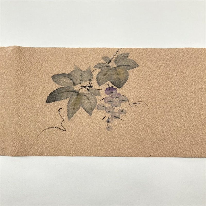 (中古)名古屋帯 洗柿色 ピンクベージュ カジュアル 名古屋仕立て ちりめん 手描き 葡萄 絹
