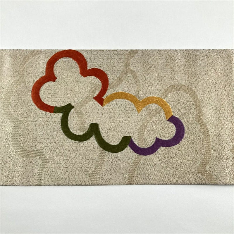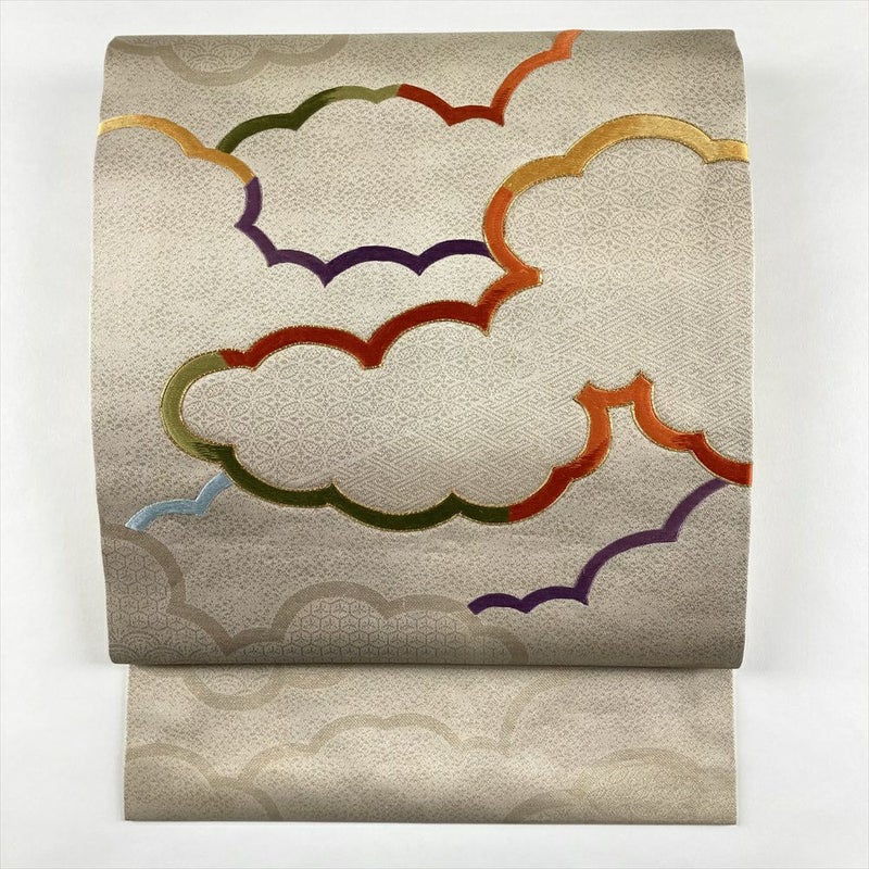 正絹の滑らかな質感に、優美な雲文様が浮かび上がる名古屋帯です。地には金色の吉祥文様が織り込まれ、華やかさと上品さを兼ね備えた逸品です。