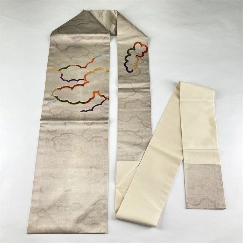 (中古)名古屋帯 金 ベージュ カジュアルからセミフォーマル 名古屋仕立て 刺繍 引き箔 雲文様 絹