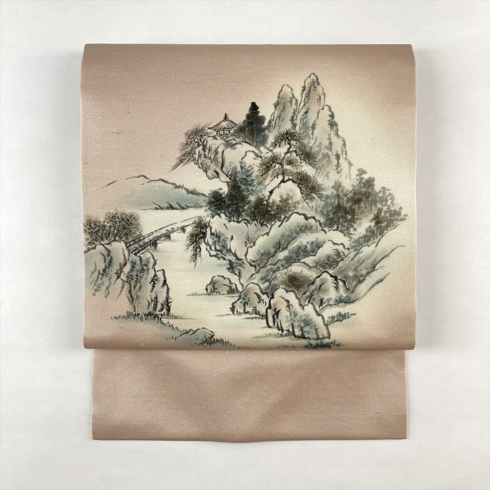 (中古)名古屋帯 薄ベージュ カジュアル 名古屋仕立て 紬 手描き 山水画 絹