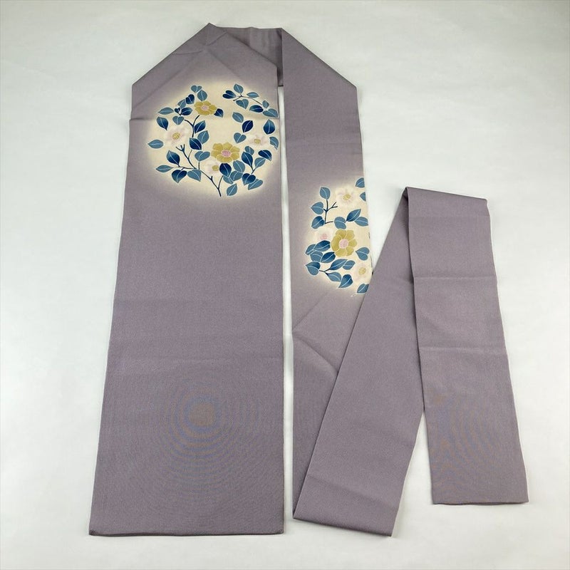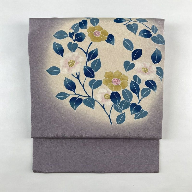 (中古)名古屋帯 薄紫 カジュアル 名古屋仕立て 縮緬 染め 椿 絹