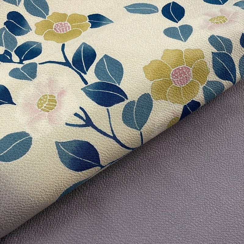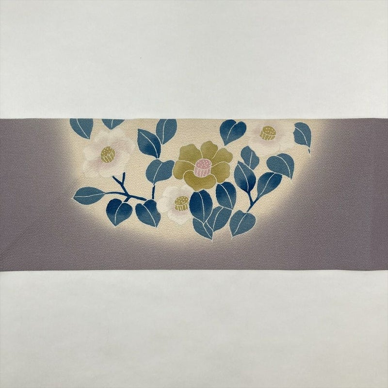 しなやかな縮緬地に、華やかな椿が咲き誇る染め名古屋帯。
