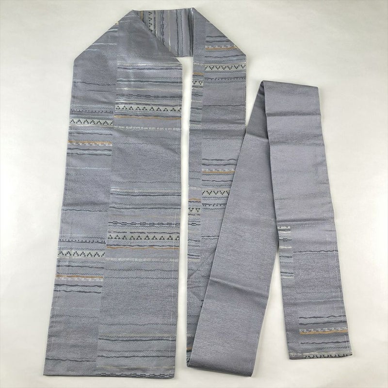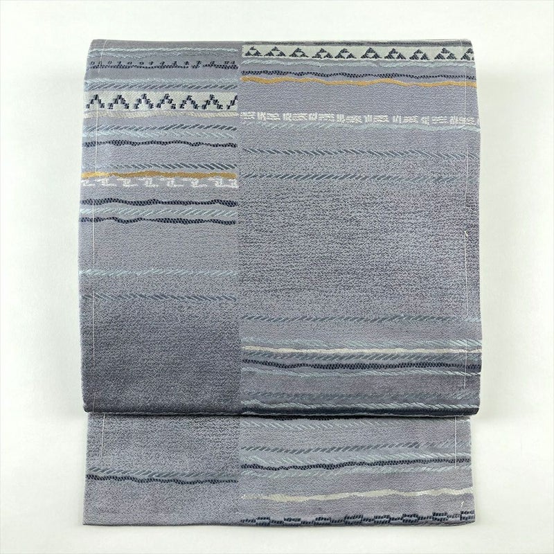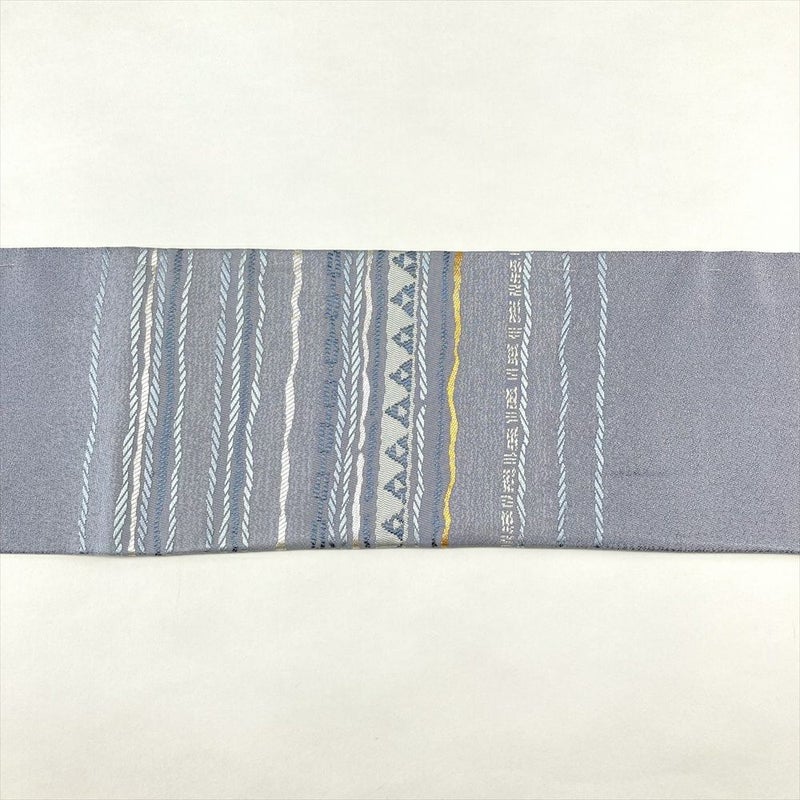 (中古)名古屋帯 ブルーグレー カジュアル 名古屋仕立て 金糸 銀糸 変わり横段文様 絹