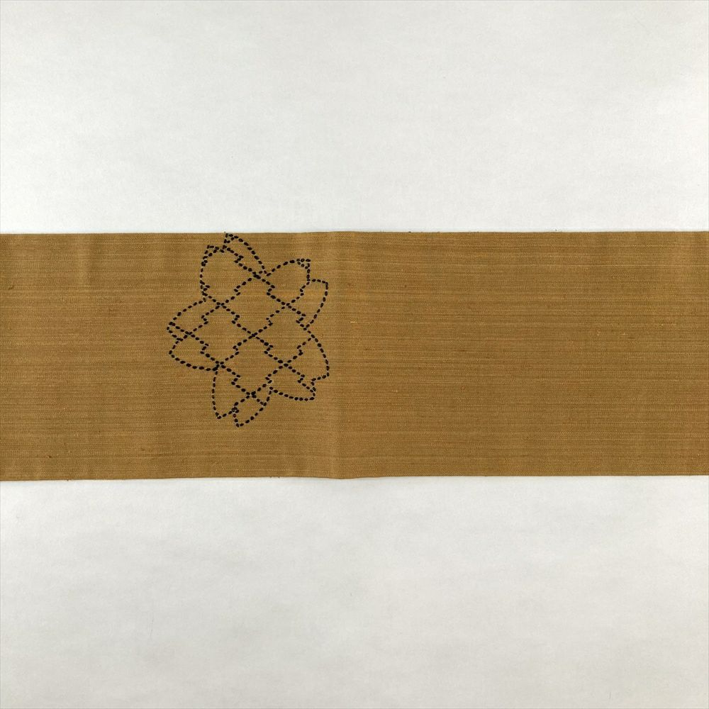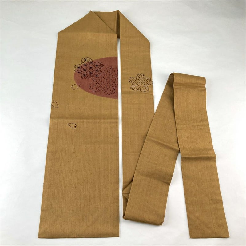 (中古)名古屋帯 芥子色 金茶 カジュアル 名古屋仕立て 紬 染め 刺し子 桜 麻の葉 絹