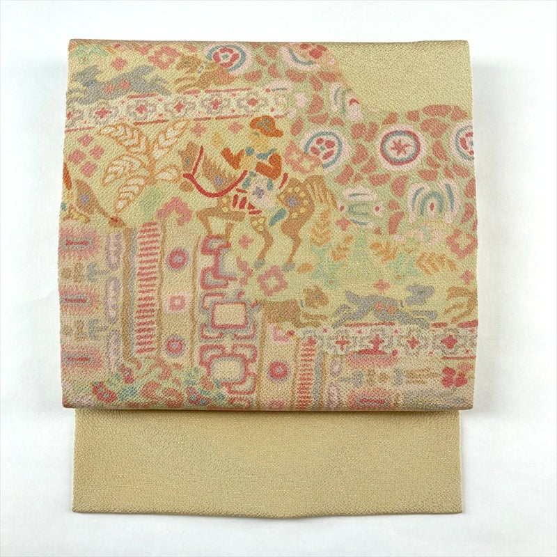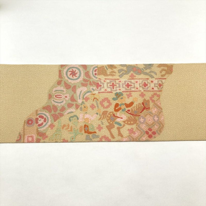 しなやかな縮緬地に、のびやかにオリエンタル文様が染め上げられた九寸帯です。