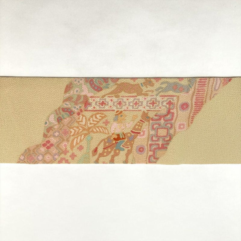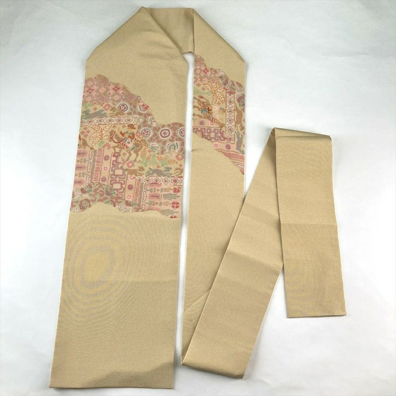(中古)名古屋帯 ベージュ カジュアル 名古屋仕立て 縮緬 染め オリエンタル 絹