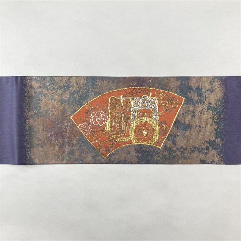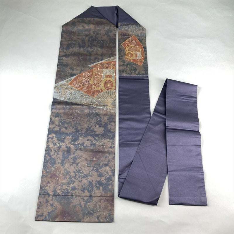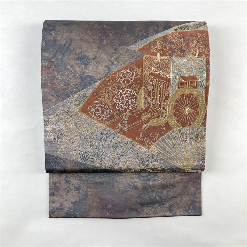 (中古)名古屋帯 灰紫 カジュアル 名古屋仕立て 引き箔 扇に御所車 絹