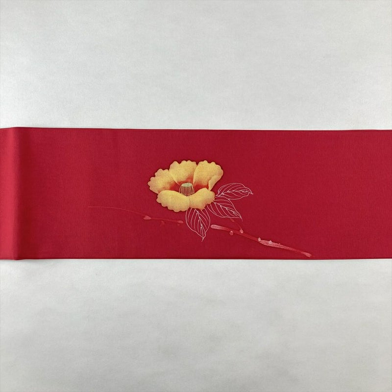 (中古)名古屋帯 赤 カジュアル 名古屋仕立て 塩瀬 ロウケツ 金彩 椿 絹
