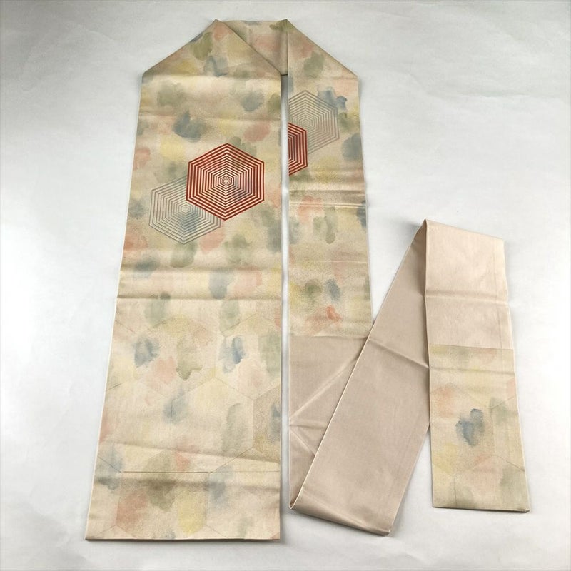 (中古)名古屋帯 ベージュ ペールオレンジ カジュアル 名古屋仕立て 金糸 色糸 亀甲重ね 絹