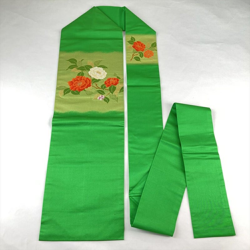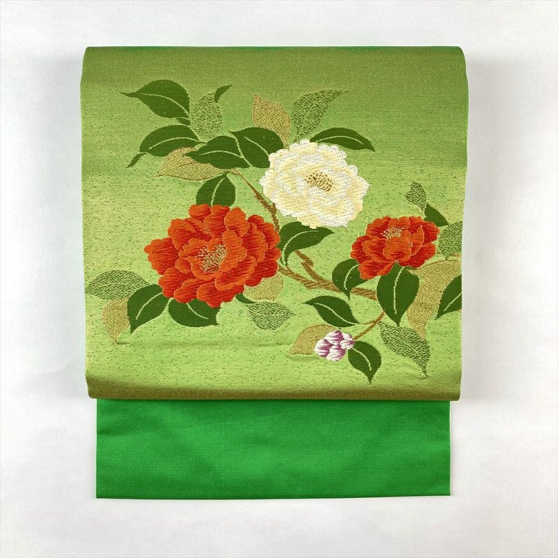 (中古)名古屋帯 緑 カジュアル 名古屋仕立て 引き箔 金糸 色糸 紅白椿 絹