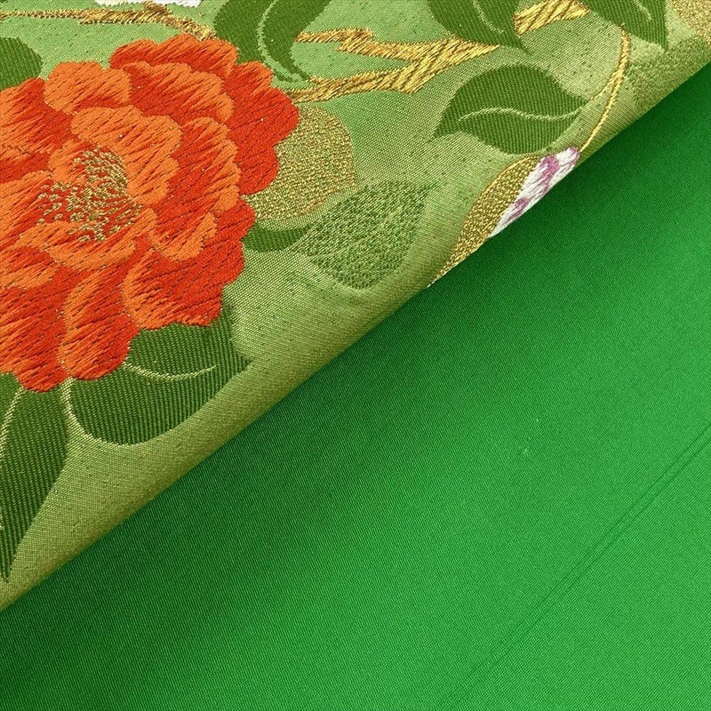 【色柄】緑 カジュアル 紅白椿 引き箔 金糸 色糸
