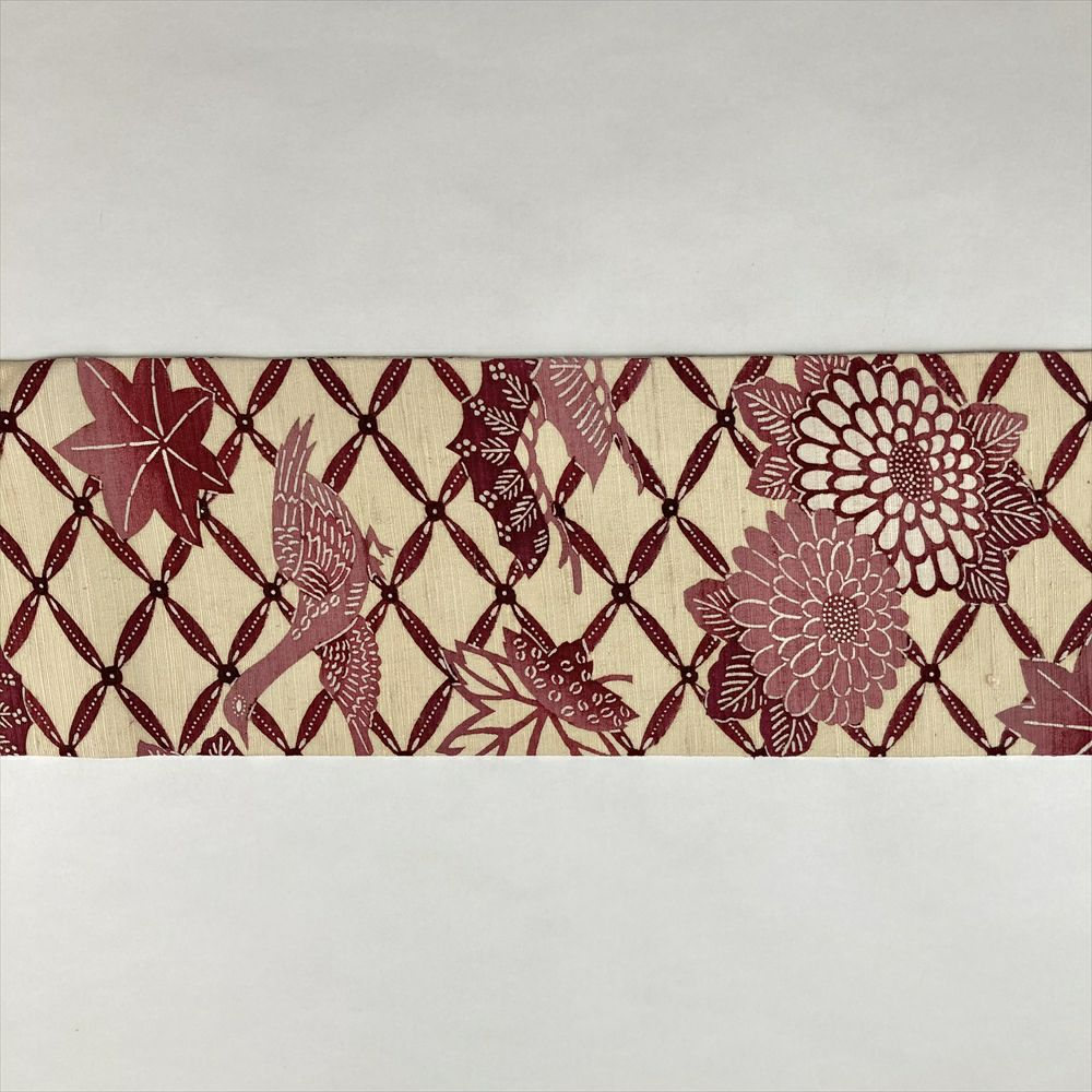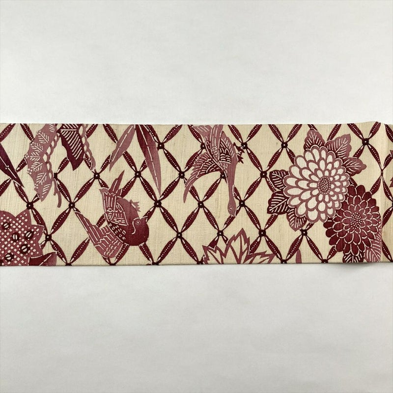 素朴な紬地に、型絵染で表現された愛らしい花鳥が舞う九寸帯です。