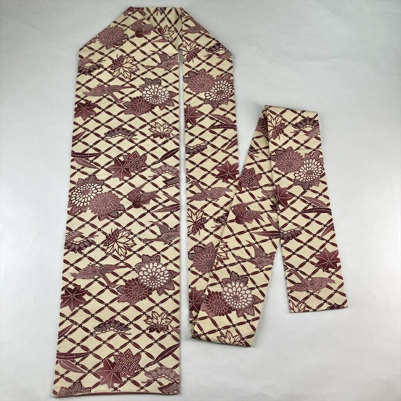 (中古)名古屋帯 生成り カジュアル 名古屋仕立て 紬地 染め 七宝に花鳥 絹