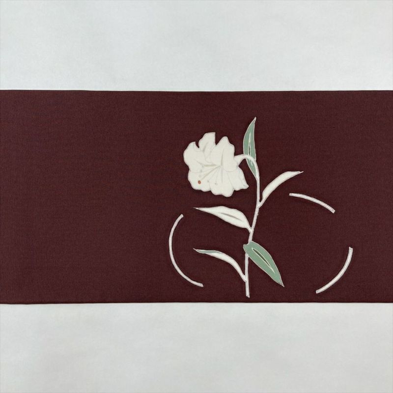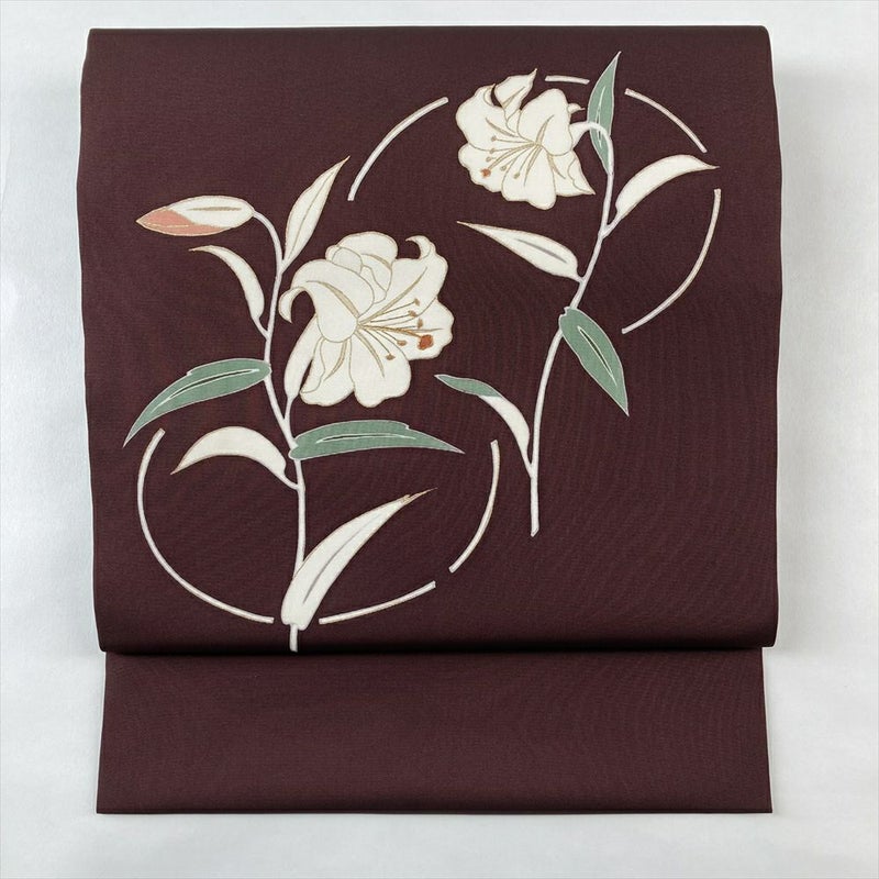 なめらかな塩瀬の生地に、優美な百合の花が咲き誇る九寸名古屋帯です。