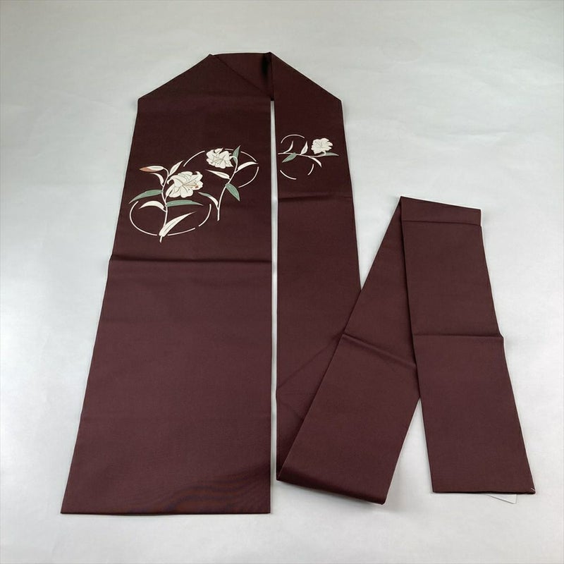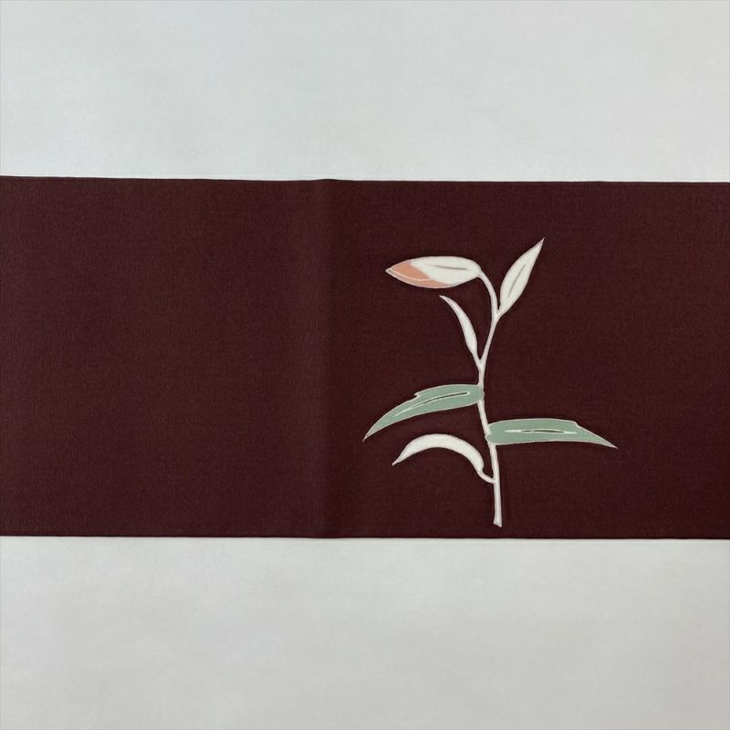 (中古)名古屋帯 焦げ茶 濃赤紫 カジュアル 名古屋仕立て 塩瀬 染め 百合の花 絹