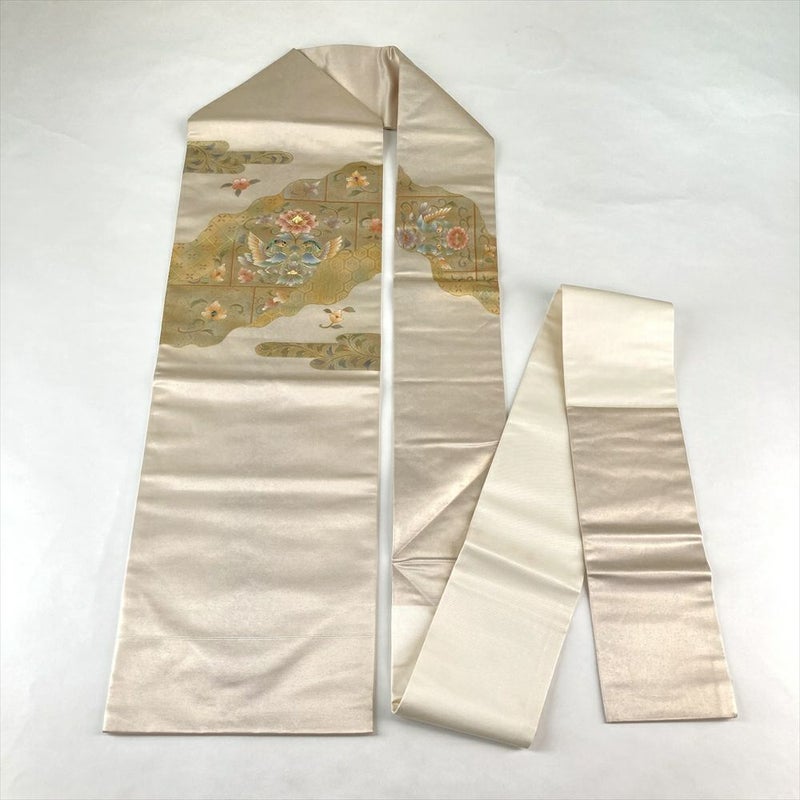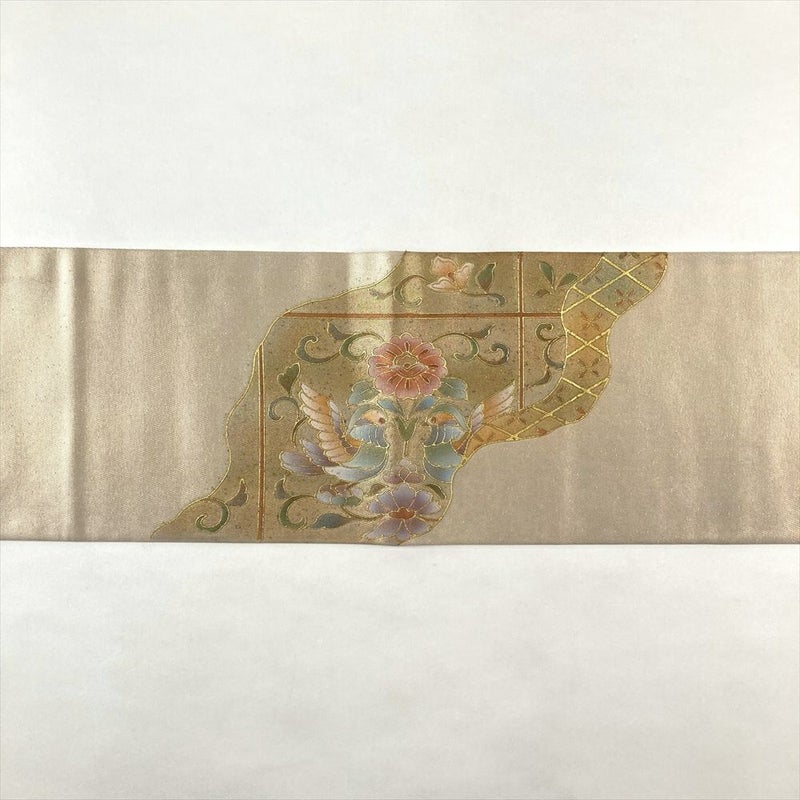 (中古)名古屋帯 白金 カジュアル 名古屋仕立て 盛り金 向かい鳥 絹