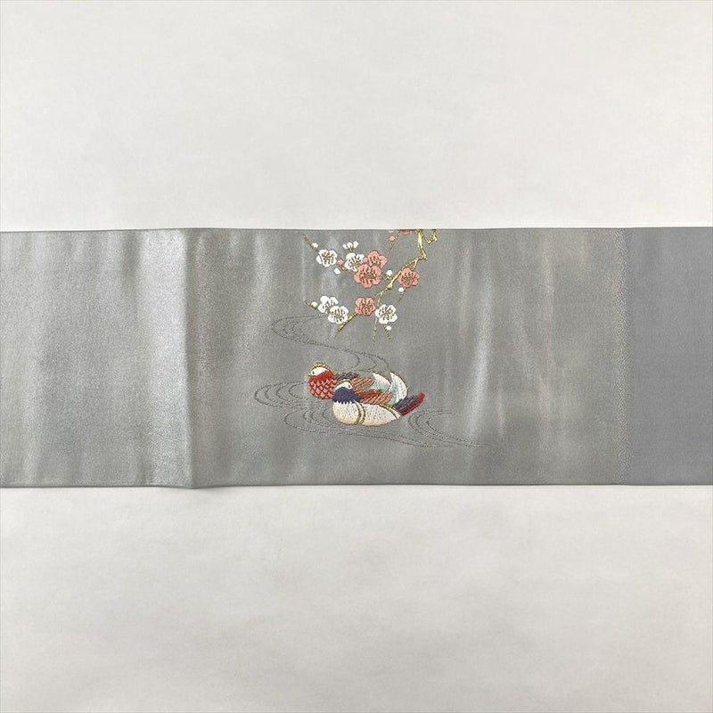 (中古)名古屋帯 グレー 薄灰青 カジュアル 名古屋仕立て 引き箔 梅 鴛鴦 おしどり 絹