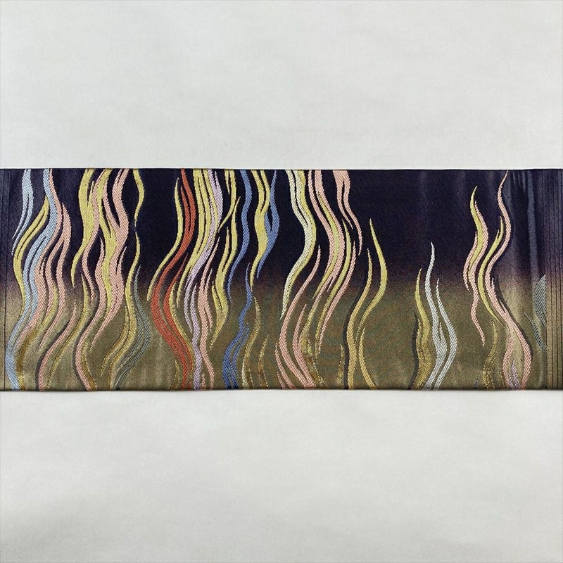 (中古)名古屋帯 紺 カジュアル 名古屋仕立て 引き箔 色糸 波 絹