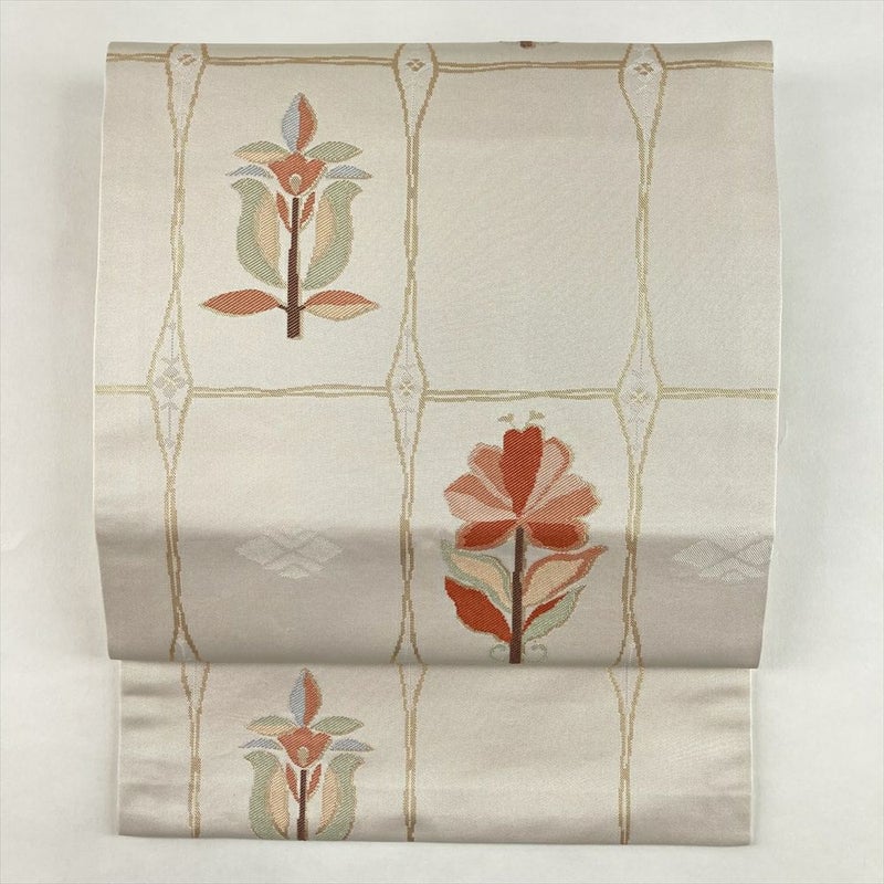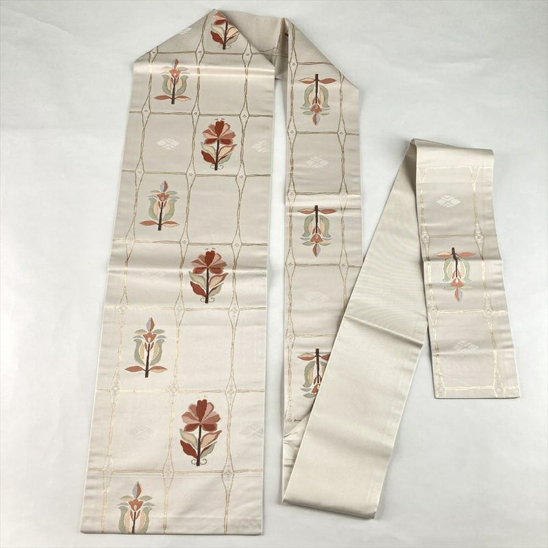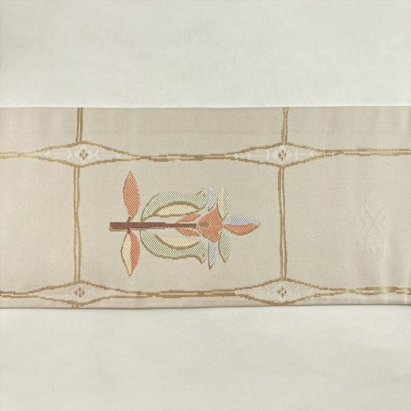 (中古)名古屋帯 アイボリー 生成 カジュアル 名古屋仕立て 金糸 オリエンタル草花 絹