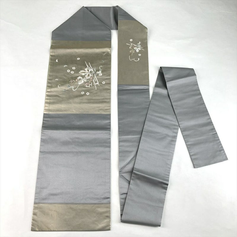 (中古)名古屋帯 白金 灰 グレー カジュアル 名古屋仕立て 金糸 瓢箪 絹