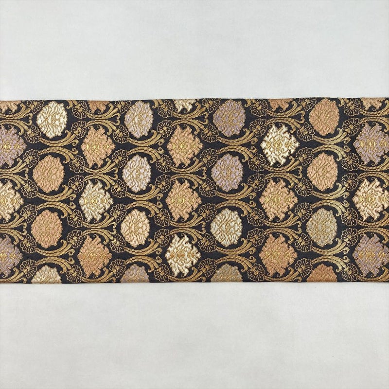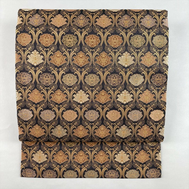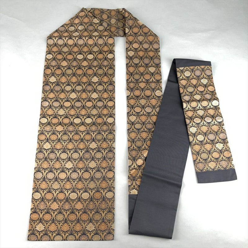 (中古)名古屋帯 濃灰 グレー カジュアル セミフォーマル 名古屋仕立て 金糸 牡丹金襴 絹