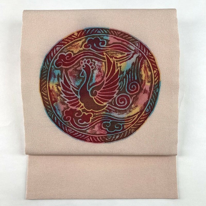 (中古)名古屋帯 灰桜 ピンク カジュアル 名古屋仕立て 縮緬 手描き 鳳凰文 絹
