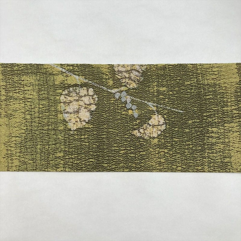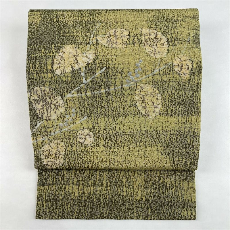 (中古)名古屋帯 鶸色 黄緑 カジュアル 名古屋仕立て 縮緬 染め 刺繍 葉と実 絹