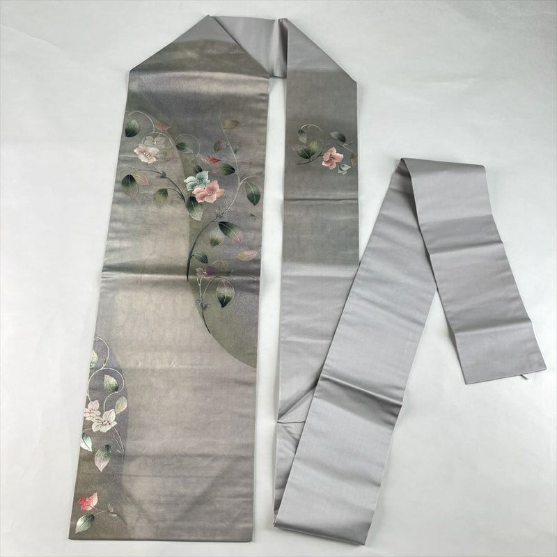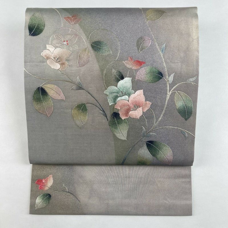 (中古)名古屋帯 グレー カジュアル 名古屋仕立て 刺繍 銀彩 蔓花 絹