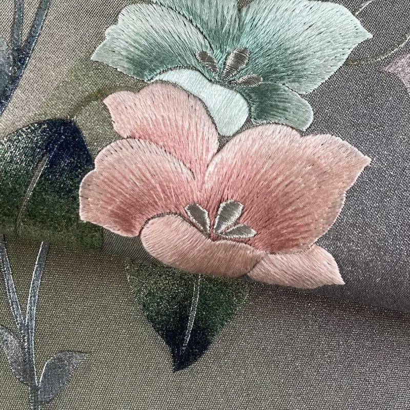 ふっくらと厚みのある刺繍で表現された蔓花が、着物姿に奥行きと華やかさを添えます。