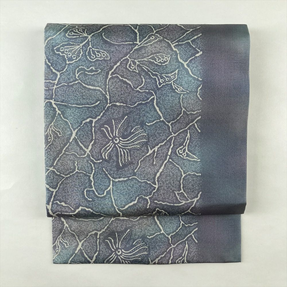 (中古)名古屋帯 ブルーグレー カジュアル 名古屋仕立て ロウケツ染 花葉 絹