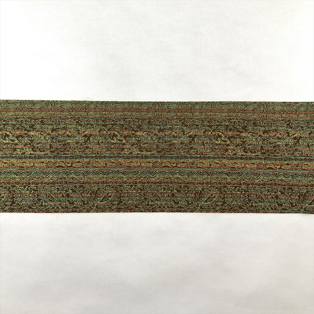 (中古)名古屋帯 焦げ茶 緑 カジュアル 名古屋仕立て 織り 更紗 絹
