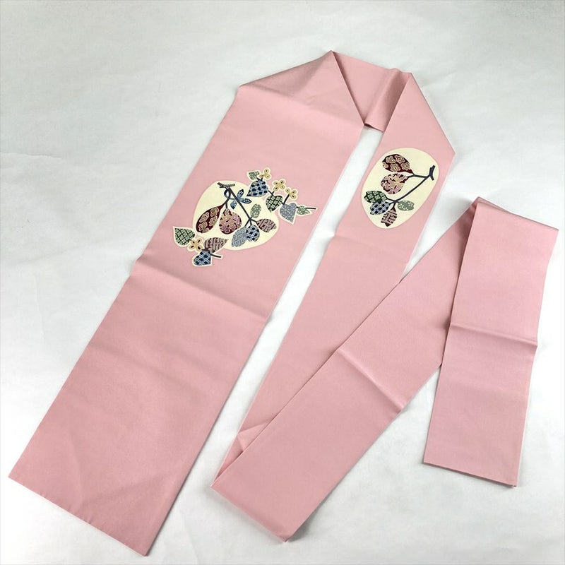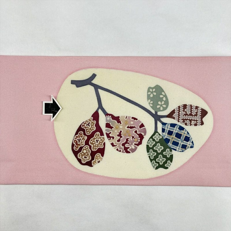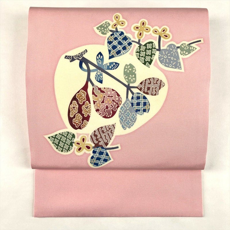 やわらかなピンクの地に、葉をモチーフとした柄が描かれた九寸名古屋帯。
