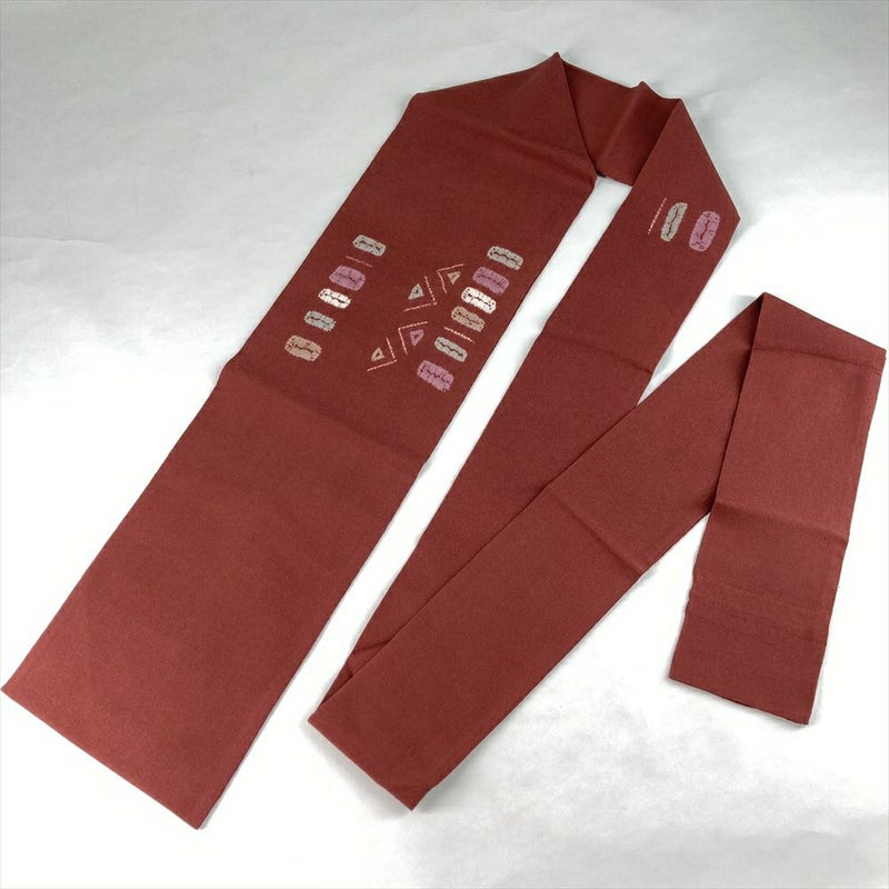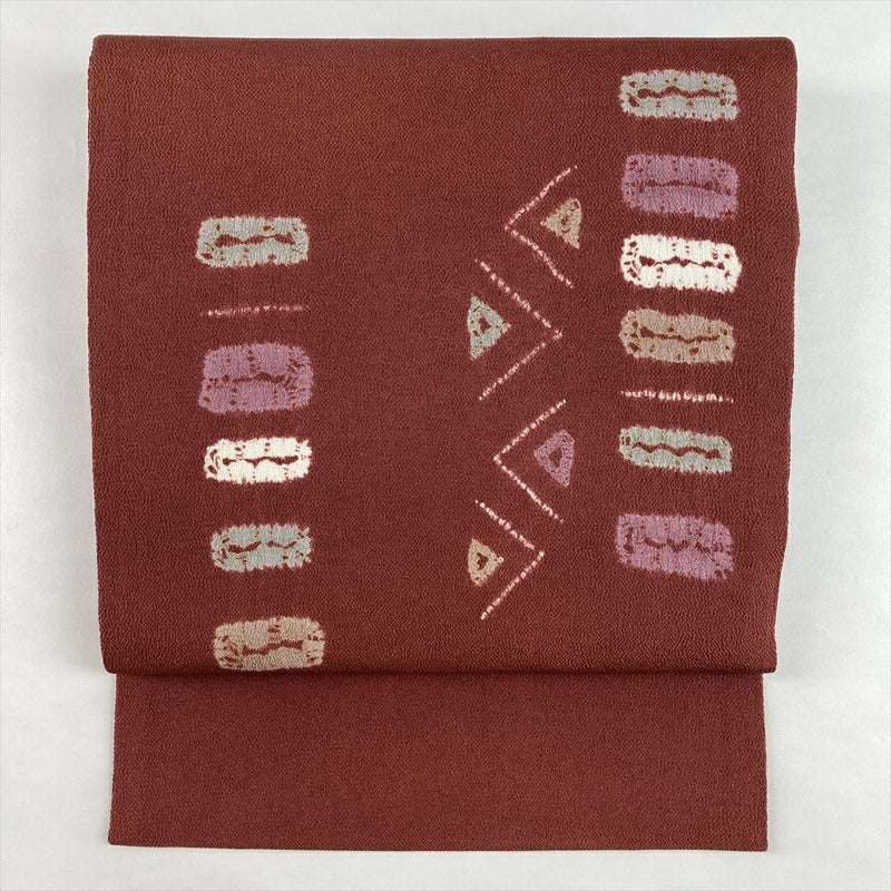 深みのある臙脂赤地に、絞りで描かれた抽象柄が映える名古屋帯。