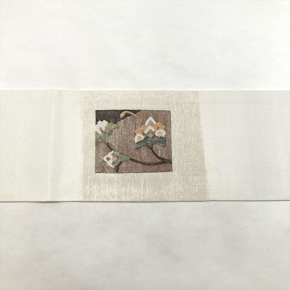 (中古)名古屋帯 クリーム カジュアル 名古屋仕立て 織り 色糸 花草 絹